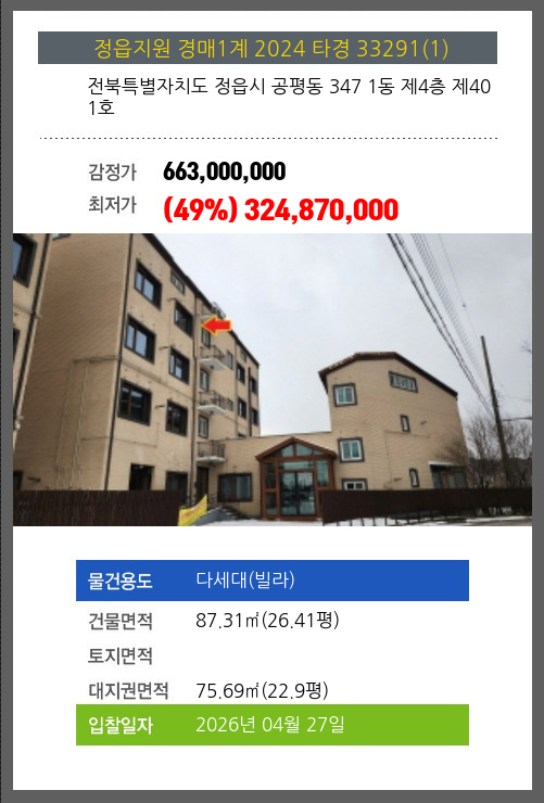 정읍빌라경매 정읍시 공평동 347 1동 제4층 제401호 №2024 타경 33291(1)