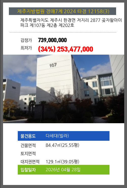 본건은 제주특별자치도 제주시 한경면 저지리 2877 곶자왈아이파크 제107동 제2층 제202호