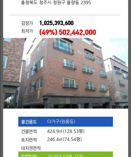 | 용도 | 다가구(원룸등) | 채권자 | 청** | 감정가 | 561,702,720 |