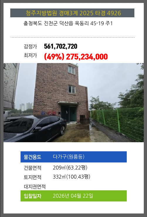 | 건물면적 | 209㎡ (63.22평) | 채무자 | 이** | 최저가 | (49%) 275,234,000 |