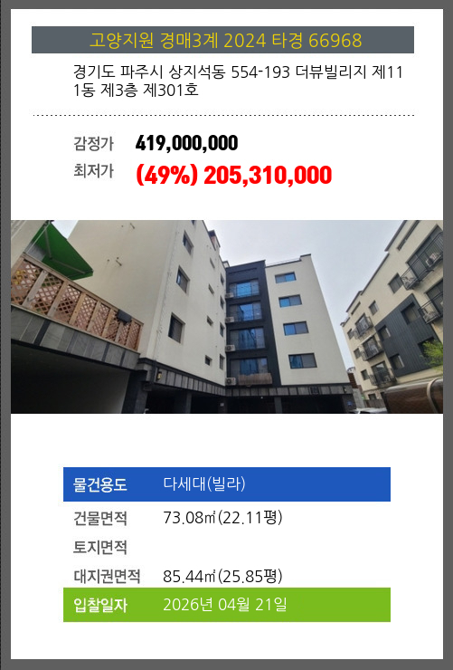 본건은 경기도 파주시 상지석동 554-193 더뷰빌리지 제111동 제3층 제301호