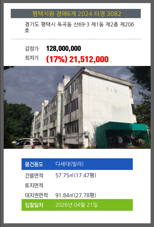 | 건물면적 | 57.75㎡ (17.47평) | 채무자 | 최** | 최저가 | (17%) 21,512,000 |