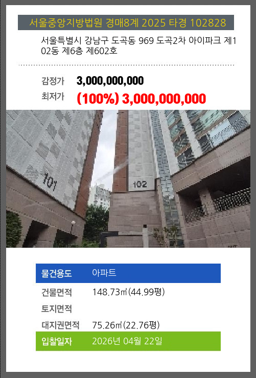 본건은 서울특별시 강남구 도곡동 969 도곡2차 아이파크 제102동 제6층 제602호
