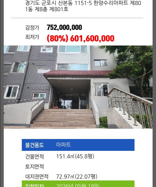 | 용도 | 아파트 | 채권자 | ㈜**외1명 | 감정가 | 1,080,000,000 |