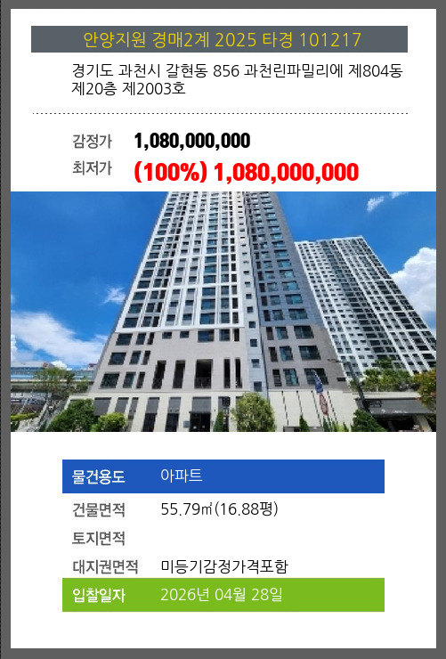 | 소재지 | [지번] 경기도 과천시 갈현동 856 과천린파밀리에 제804동 제20층 제2003호 [도로명 주소] 경기도 과천시 과천대로2길 11 과천린파밀리에 제804동 제20층 제2003호 |