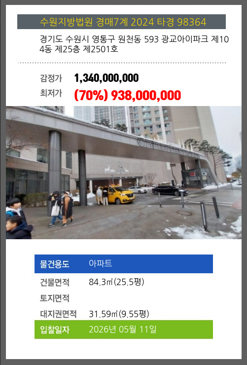본건은 경기도 수원시 영통구 원천동 593 광교아이파크 제104동 제25층 제2501호