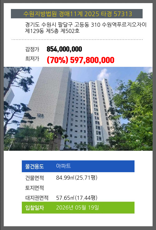 본건은 경기도 수원시 팔달구 고등동 310 수원역푸르지오자이 제129동 제5층 제502호