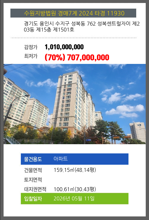 본건은 경기도 용인시 수지구 성복동 762 성복센트럴자이 제203동 제15층 제1501호