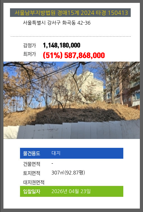| 토지면적 | 307㎡ (92.87평) | 소유자 | 강**외2명 | 보증금 | (10%) 58,786,800 |