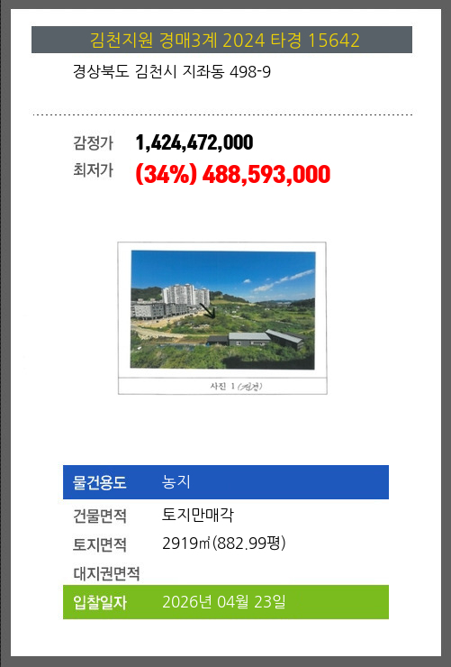 | 용도 | 농지 | 채권자 | 초** | 감정가 | 1,424,472,000 |