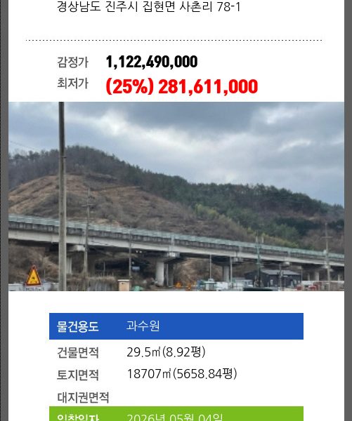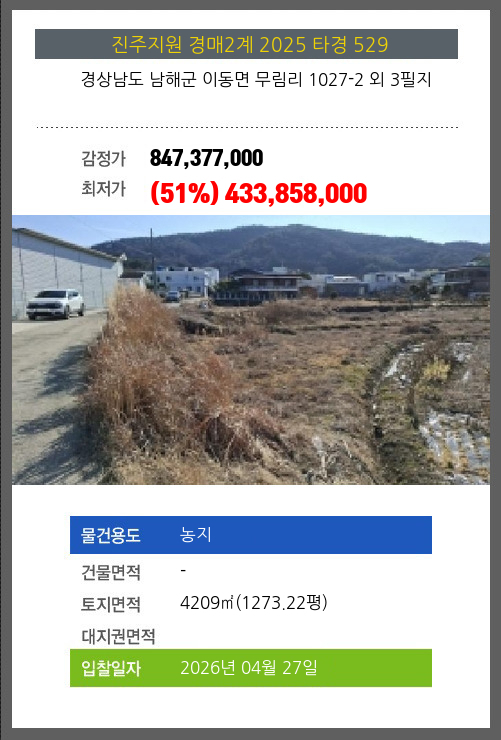 | 용도 | 농지 | 채권자 | 경** | 감정가 | 847,377,000 |