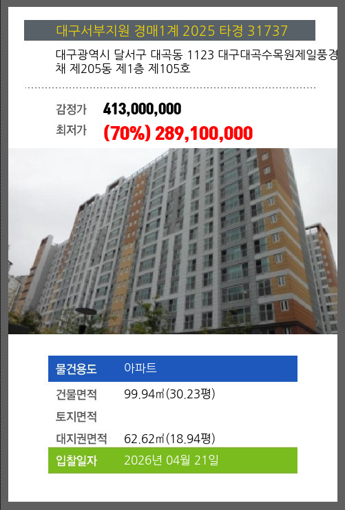 달서아파트경매 달서구 대곡동 1123 대구대곡수목원제일풍경채 제205동 제1층 제105호 №2025 타경 31737