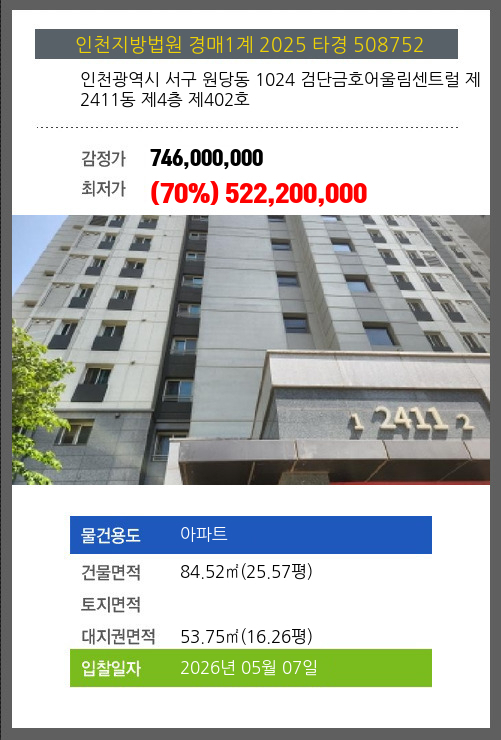 건물면적 84.52㎡ (25.57평) 채무자 김** 최저가 (70%) 522,200,000