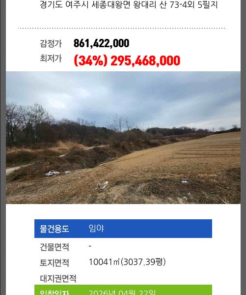 | 토지면적 | 19438㎡ (5879.97평) | 소유자 | 김**외2명 | 보증금 | (10%) 48,004,100 |