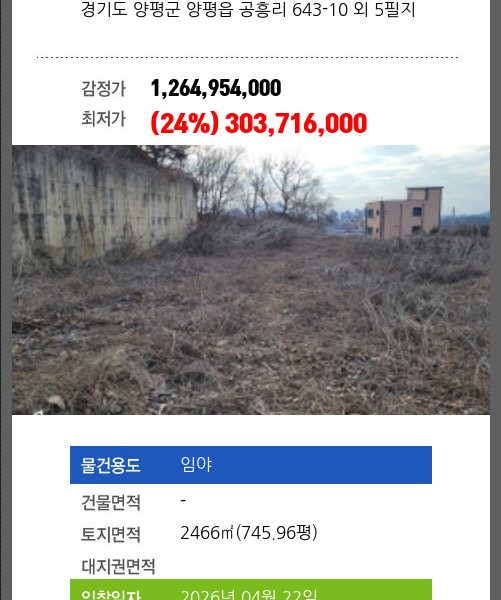 | 매각대상 | 토지만매각, 법정지상권 | 경매종류 | 임의경매 | 사건접수일 | 2024-02-06 |