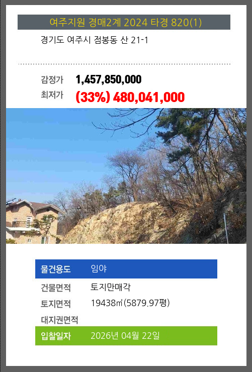 | 용도 | 임야 | 채권자 | 여** | 감정가 | 1,457,850,000 |