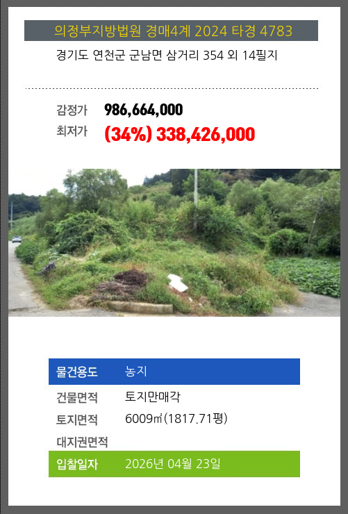 | 용도 | 농지 | 채권자 | 이**외1명 | 감정가 | 986,664,000 |