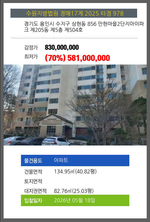 | 건물면적 | 134.95㎡ (40.82평) | 채무자 | 최**외2명 | 최저가 | (70%) 581,000,000 |