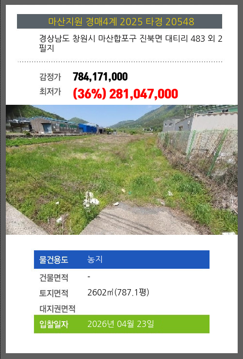 창원농지경매 창원시 마산합포구 진북면 대티리 483 외 2필지 №2025 타경 20548