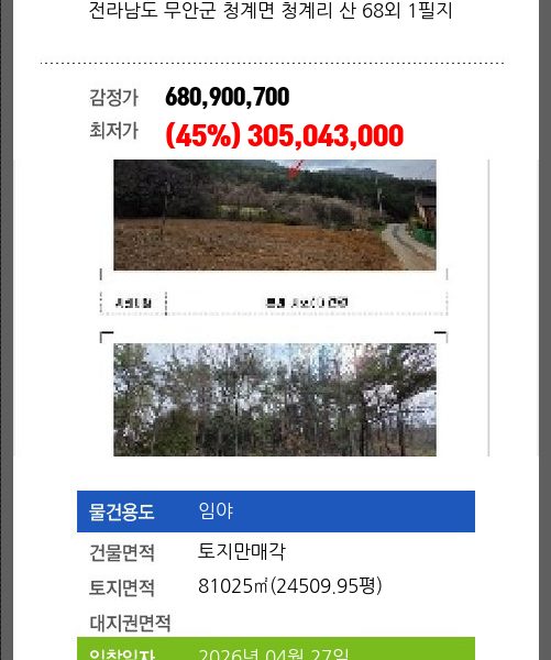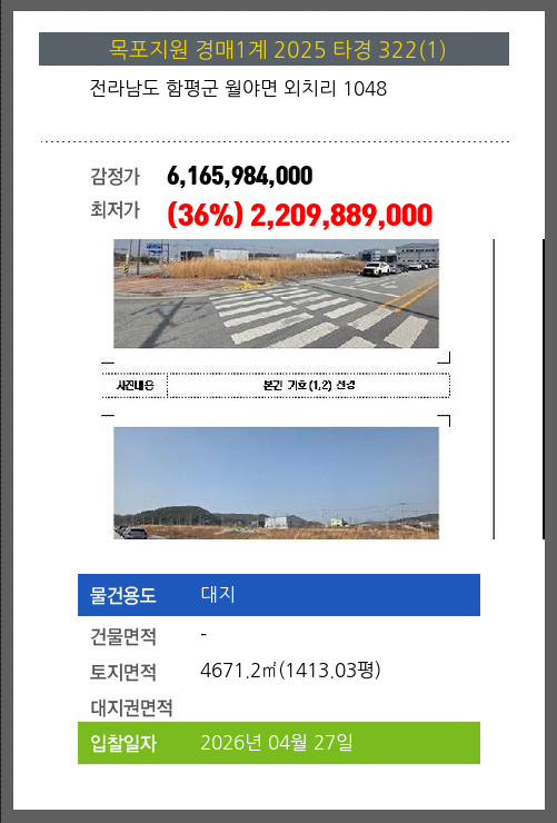 | 토지면적 | 4671.2㎡ (1413.03평) | 소유자 | ㈜** | 보증금 | (10%) 220,988,900 |