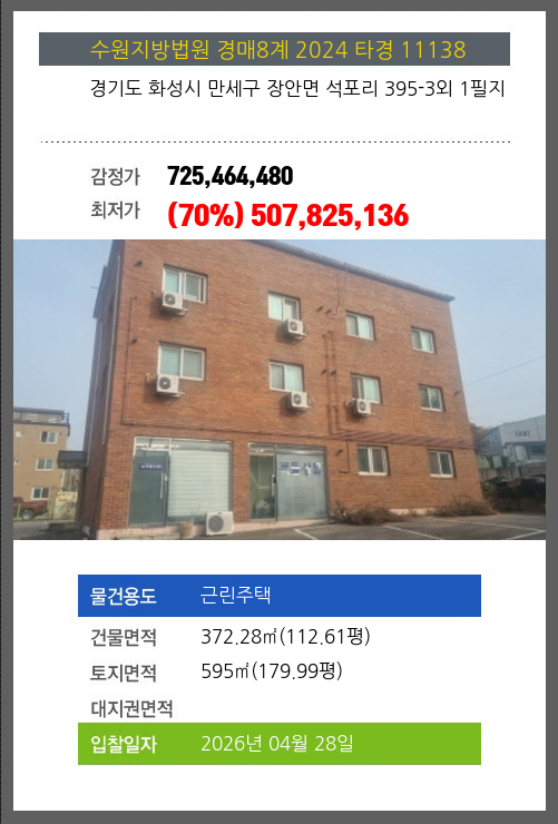 | 용도 | 근린주택 | 채권자 | 달** | 감정가 | 725,464,480 |
