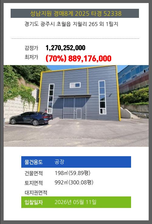| 건물면적 | 198㎡ (59.89평) | 채무자 | ㈜** | 최저가 | (70%) 889,176,000 |