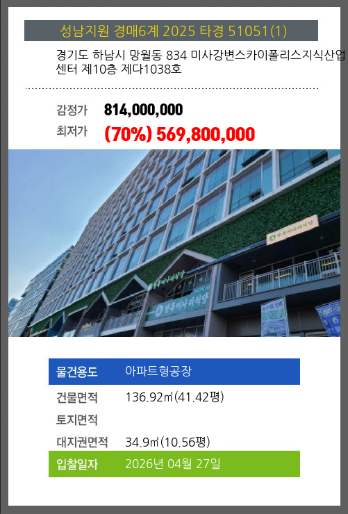 본건은 경기도 하남시 망월동 834 미사강변스카이폴리스지식산업센터 제10층 제다1038호