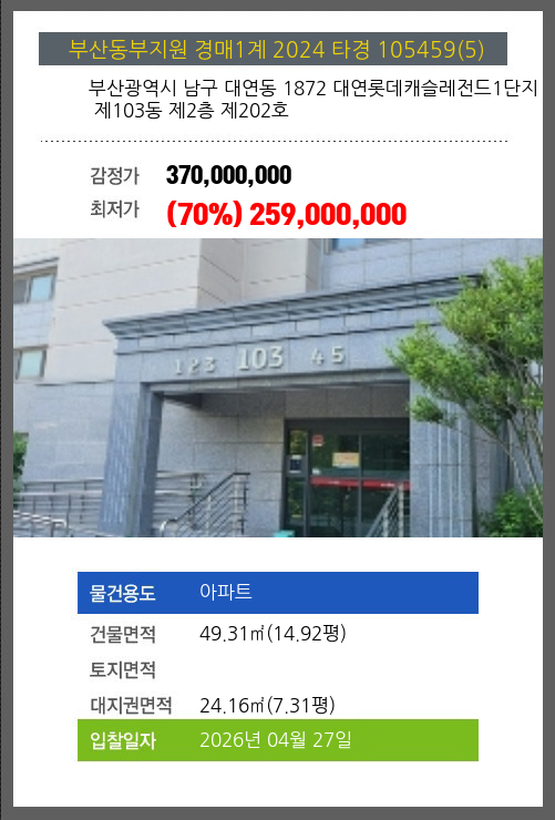 본건은 부산광역시 남구 대연동 1872 대연롯데캐슬레전드1단지 제103동 제2층 제202호