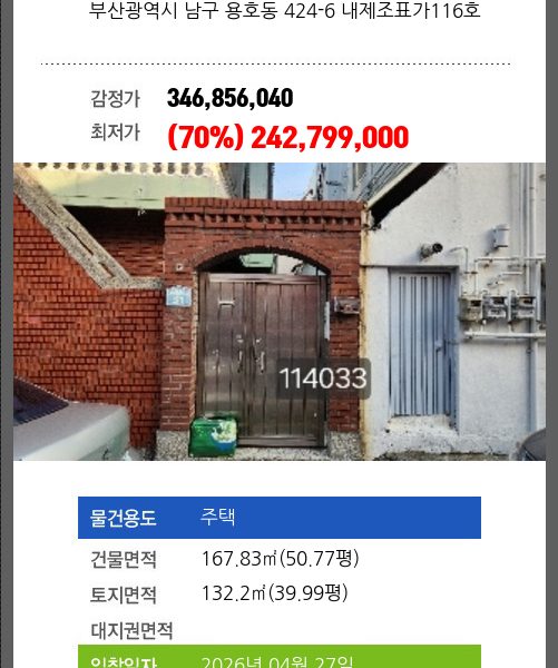 | 매각대상 | 공시가격1~2억 | 경매종류 | 임의경매 | 사건접수일 | 2024-05-23 |