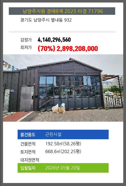 | 건물면적 | 192.58㎡ (58.26평) | 채무자 | 에** | 최저가 | (70%) 2,898,208,000 |
