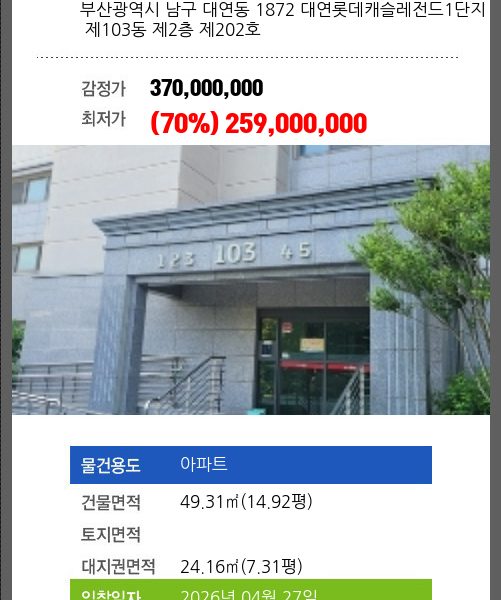 | 매각대상 | 공시가격1~2억 | 경매종류 | 임의경매 | 사건접수일 | 2024-12-30 |
