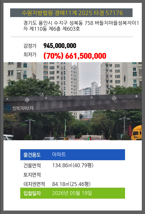 용인아파트경매 용인시 수지구 성복동 758 버들치마을성복자이1차 제110동 제6층 제603호 №2025 타경 57176