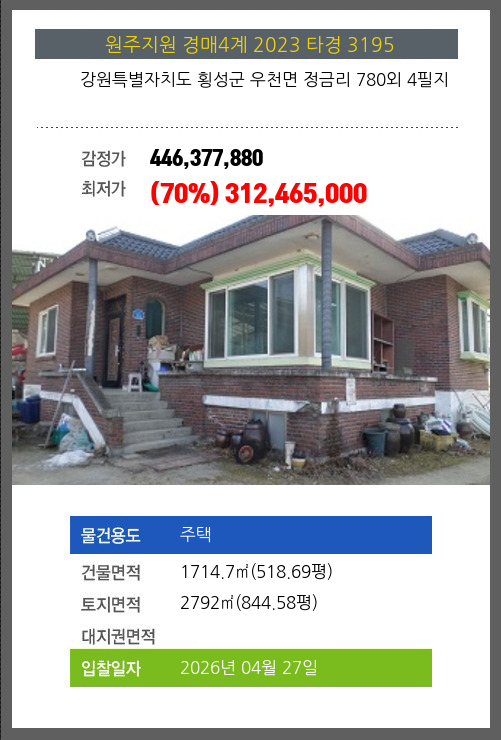 | 소재지 | [지번] 강원특별자치도 횡성군 우천면 정금리 780외 4필지 [도로명 주소] 강원도 횡성군 우천면 경강로정금2길 33외 4필지 |