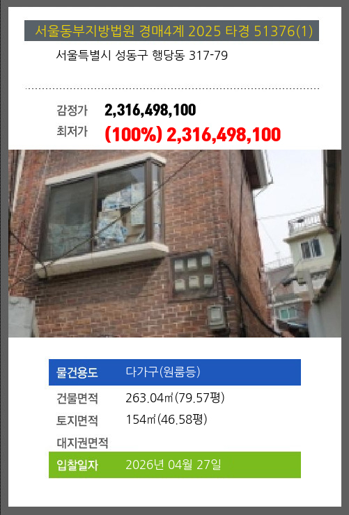 | 건물면적 | 263.04㎡ (79.57평) | 채무자 | 이** | 최저가 | (100%) 2,316,498,100 |