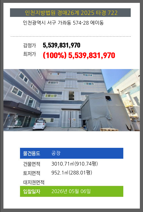| 건물면적 | 3010.71㎡ (910.74평) | 채무자 | 건** | 최저가 | (100%) 5,539,831,970 |