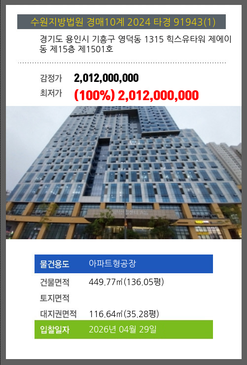 용인아파트형공장경매 용인시 기흥구 영덕동 1315 힉스유타워 제에이동 제15층 제1501호 №2024 타경 91943(1)
