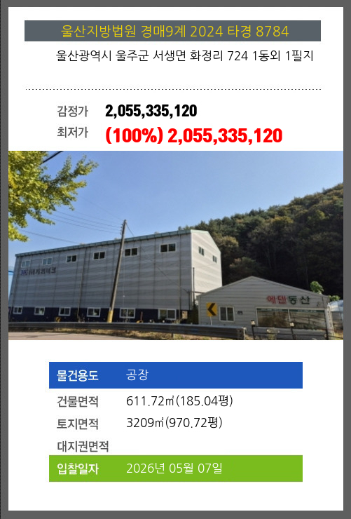 | 용도 | 공장 | 채권자 | ㈜** | 감정가 | 2,055,335,120 |