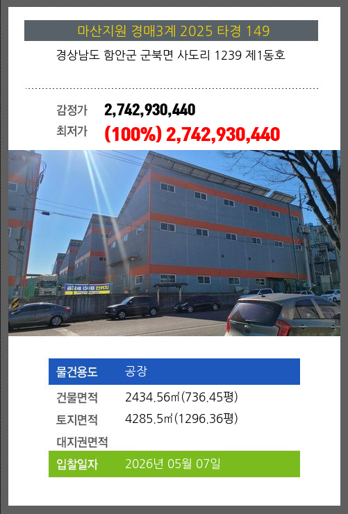 | 용도 | 공장 | 채권자 | 더** | 감정가 | 2,742,930,440 |
