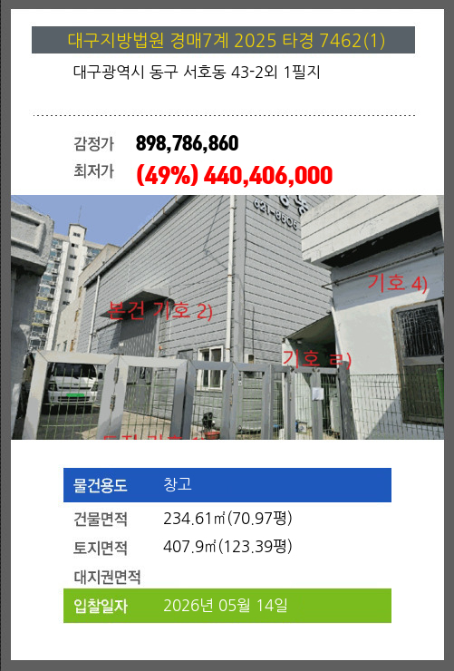 | 용도 | 창고 | 채권자 | 대** | 감정가 | 898,786,860 |