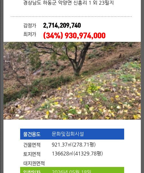 토지면적 5636㎡ (1704.88평) 소유자 남**외1명 보증금 (10%) 46,014,200