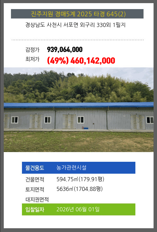 사천농가관련시설경매 사천시 서포면 외구리 330외 1필지 №2025 타경 645(2)