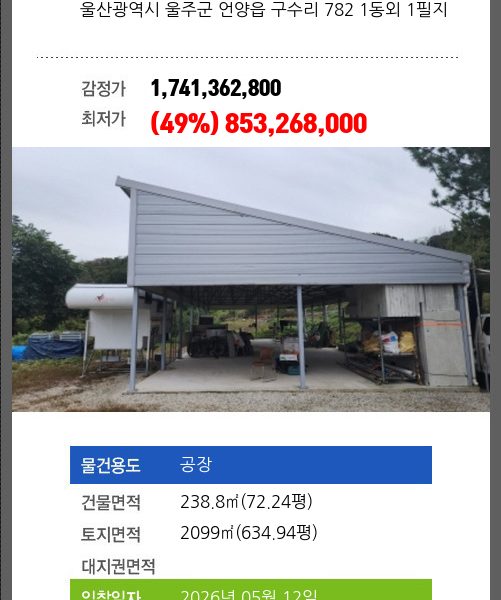 | 소재지 | [지번] 울산광역시 울주군 두서면 차리 409-2 1동외 2필지 [도로명 주소] 울산광역시 울주군 두서면 구량차리로 391-44 1동외 2필지 |
