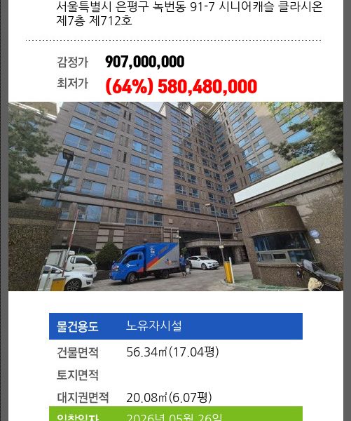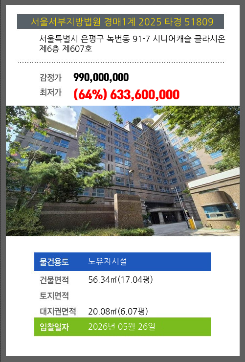 본건은 서울특별시 은평구 녹번동 91-7 시니어캐슬 클라시온 제6층 제607호