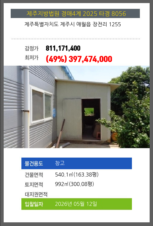 | 용도 | 창고 | 채권자 | 중** | 감정가 | 811,171,400 |