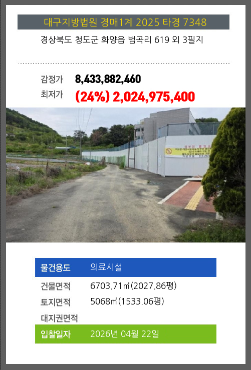 | 용도 | 의료시설 | 채권자 | 박** | 감정가 | 8,433,882,460 |