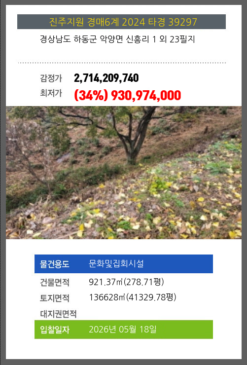 하동문화및집회시설경매 하동군 악양면 신흥리 1 외 23필지 №2024 타경 39297