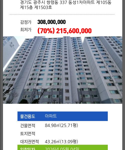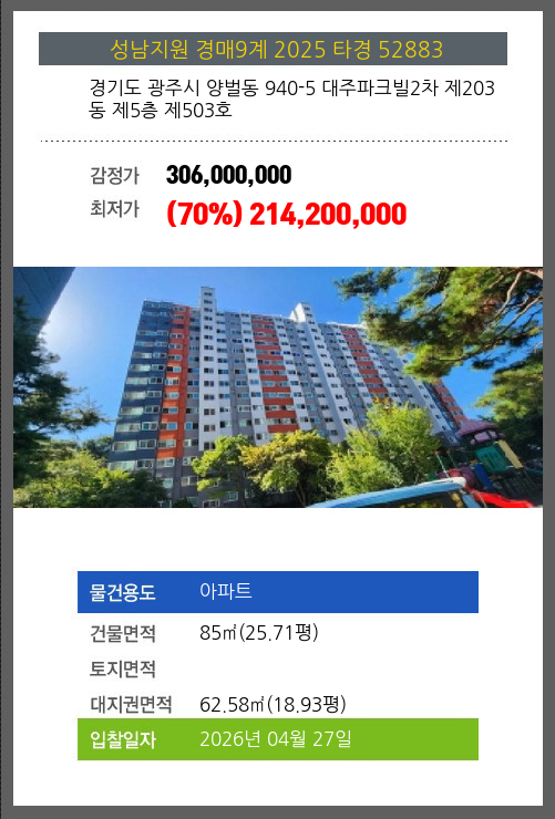 광주아파트경매 광주시 양벌동 940-5 대주파크빌2차 제203동 제5층 제503호 №2025 타경 52883