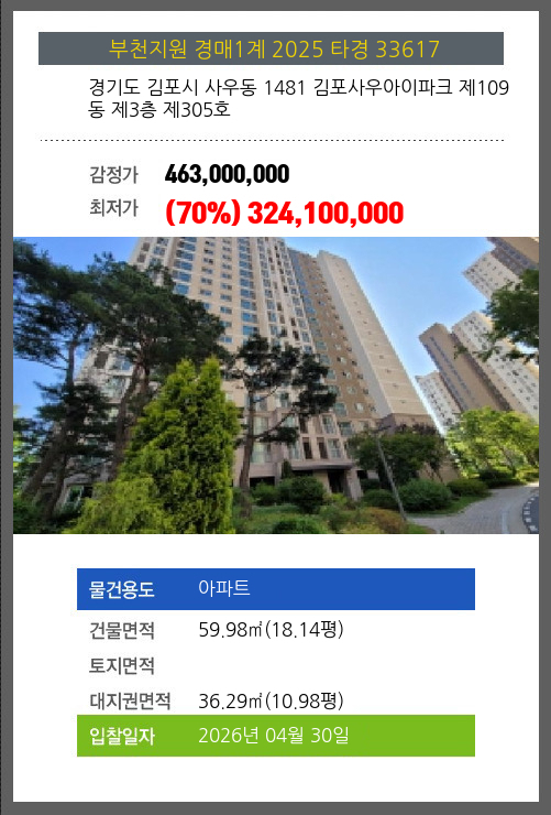 본건은 경기도 김포시 사우동 1481 김포사우아이파크 제109동 제3층 제305호