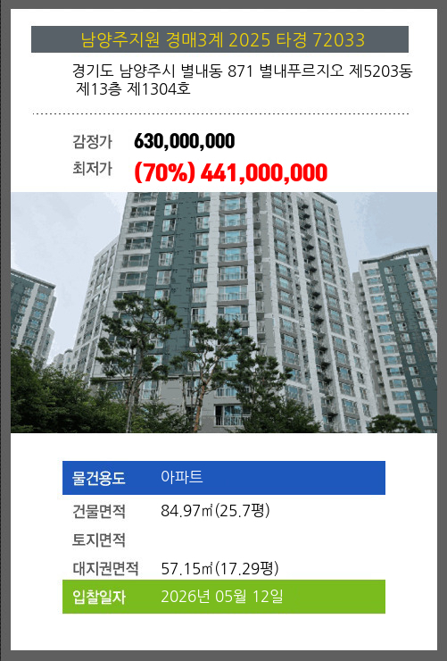 | 건물면적 | 84.97㎡ (25.7평) | 채무자 | 노** | 최저가 | (70%) 441,000,000 |