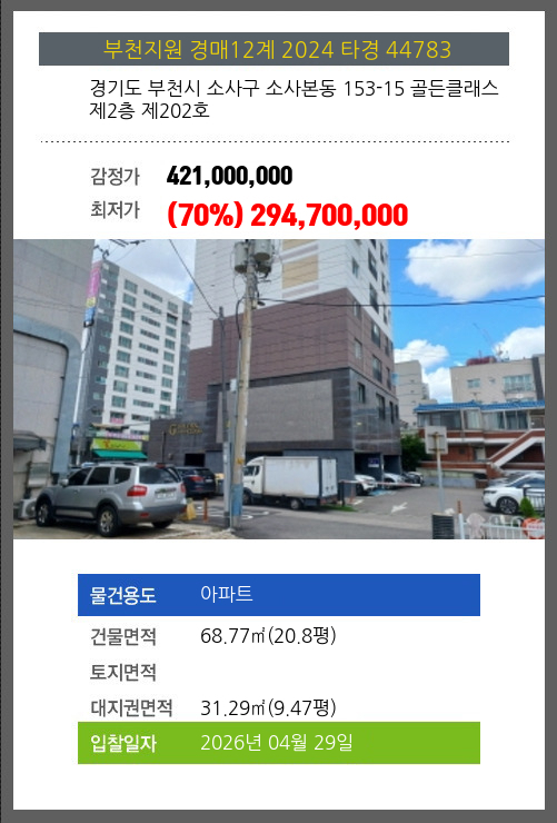 부천아파트경매 부천시 소사구 소사본동 153-15 골든클래스 제2층 제202호 №2024 타경 44783